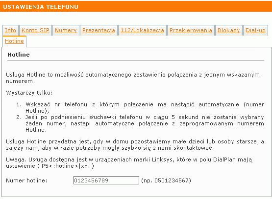 Usługa Hotline jest bezpłatna i dostępna dla wszystkich użytkowników bramek i routerów VoIP marki Linksys, którzy w polu Dial Plan swoich urządzeń mają następujący wpis: